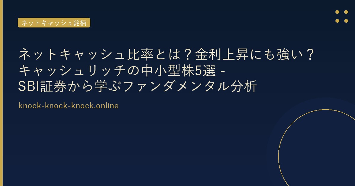 金利上昇にも強い?キャッシュリッチの中小型株5選 – SBI証券についてファンダメンタル面から見ていきます。特にネットキャッシュ比率という指標を中心に、財務状況を確認していきましょう。